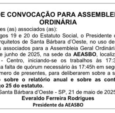A AEASBO convoca todos seus associados para a Assembleia Geral Ordinária, que será realizada:
