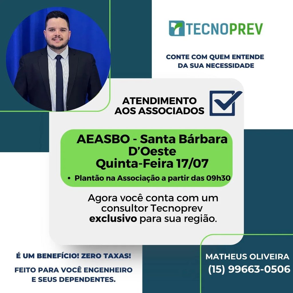 Nesta quinta-feira, 17/07, a partir das 09h30, teremos plantão especial na sede da AEASBO com o consultor Matheus Oliveira, da Tecnoprev! 💼✅