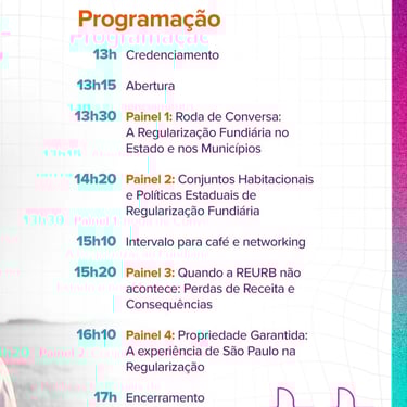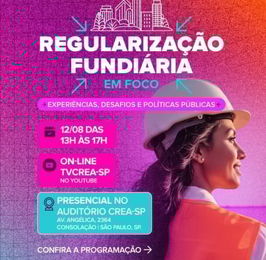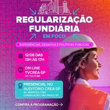 Participe do Congresso: Regularização Fundiária em Foco, promovido pelo Crea-SP. Uma tarde inteira de troca com especialistas do setor público e privado, cases reais, desafios e soluções para transformar o futuro das cidades.